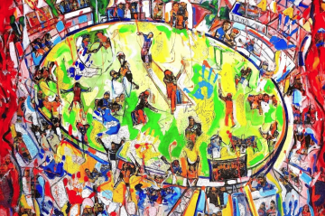 Malířka Amber Boardman pracuje s lidským tělem jako s čímsi tekutým. Její postavy připomínají spíše než lidi jakési výjevy z beztvarého, roztékajícího se panoptika. Touží po tom kontrolovat situaci, ale nejsou schopny toho dosáhnout. Obraz Slip 'N Slide Cricket zobrazující kriketovou momentku tak působí jako groteskní, ale o to mrazivější kritika naší honby za výkonem. K čemu to celé, když nejsme schopni naložit ani sami se sebou. Natožpak s nějakým míčkem… Toto dílo zároveň můžete brát jako protipól toho, co lze skrze sportovní tematiku v umění ukázat. Mnoho děl z článku využívalo kriket k adoraci sportu, všedního života, osobního kultu. Pro Boardman slouží jako prostředek ke společenské kritice.